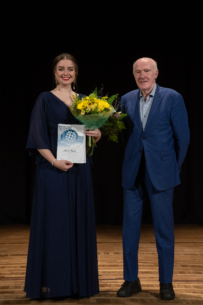 Foto 1: Vello Jürna ooperilauljate konkursi võitja Rael Rent ja Eesti Rahvuskultuuri Fondi nõukogu esimees Olav Ehala.
